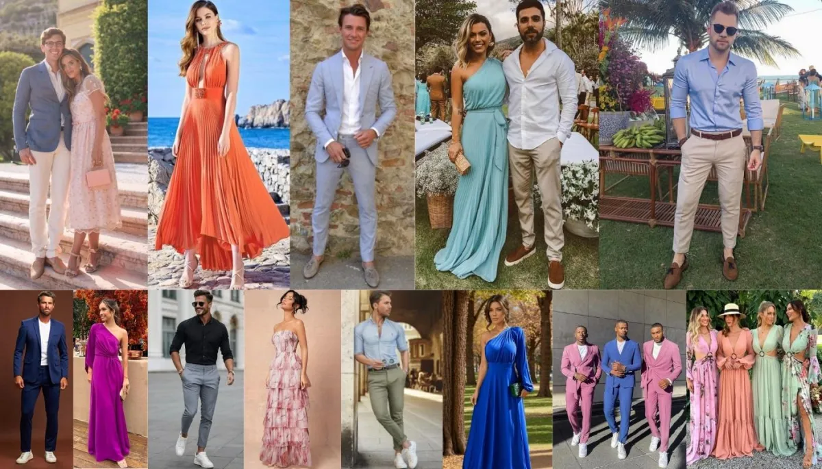 Vestidos longos e fluídos caem bem no ambiente, assim como cores claras e abertas;